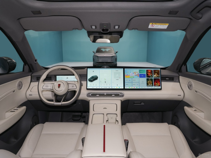内饰部分,红旗HS6 PHEV采用了全新的设计,最引人注目的是副驾驶侧双联屏,配合液晶仪表盘和HUD抬头显示组成多屏联动。